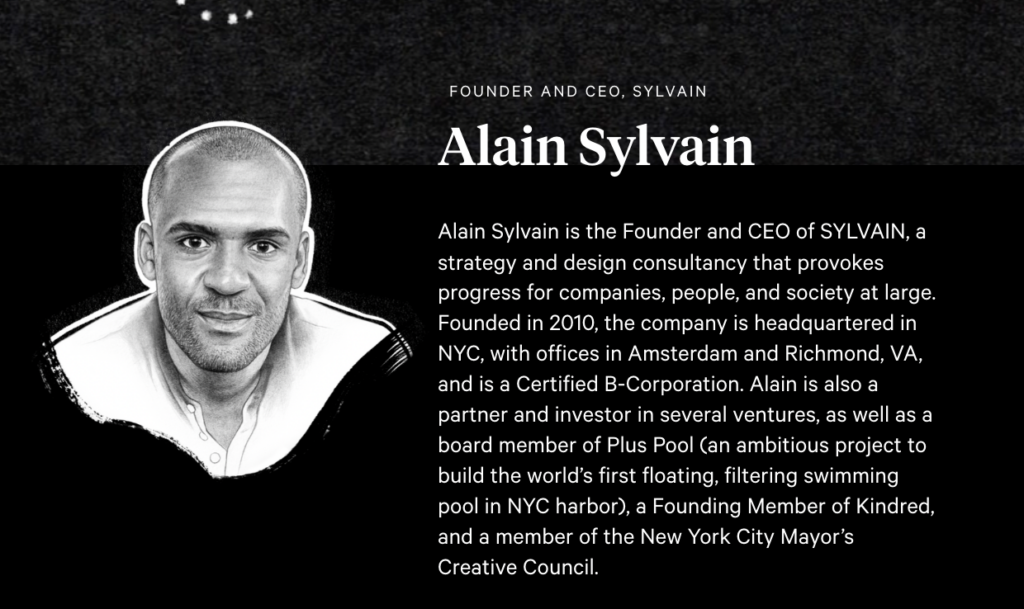 Alain is the Founder and CEO of SYLVAIN, a strategy and design consultancy that provokes progress for companies, people and society at large. Clients include Nike, Apple, Google, American Express, Spotify, Blackrock, Diageo, GM, the NBA, The New York Times and others. Founded in 2010, the company is headquartered in NYC, with offices in Los Angeles, CA, Richmond, VA and Amsterdam, the Netherlands. The company is a Certified B-Corporation.